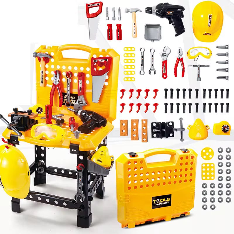 • 🪛 Plus de 100 pièces : marteau, scie, clés, pinces, tournevis, vis, écrous, planches, lunettes, masque, casque…