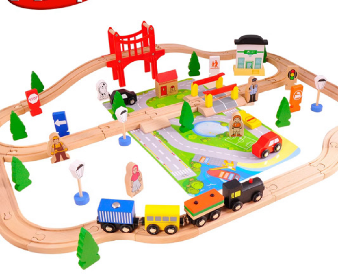 Grâce à ses rails en bois, son grand pont rouge, ses routes imprimées et ses figurines, ton enfant crée et explore sa propre ville tout en développant son imagination, sa logique et sa coordination.
